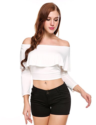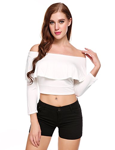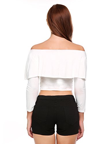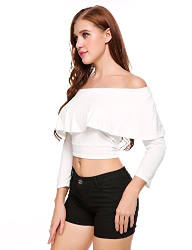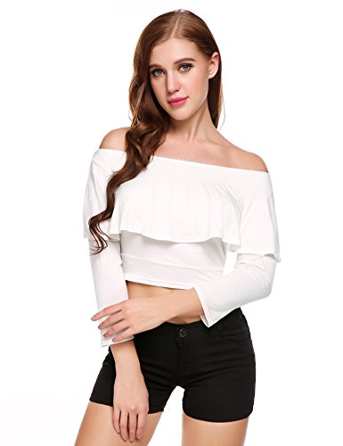 Zeagoo Women Off Shoulder Long Sleeve Sexy Slim Crop Top Blouses(White-S)